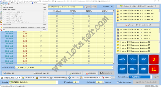 Fecha de lanzamiento del programa, ¡ SINE DIE ! Motivo, se están añadiendo nuevas opciones, mejorando prestaciones y, como no, optimizando las Loterías implementadas pero, por no poder dedicarle de forma diaria, las horas necesarias, llevará mucho más tiempo del esperado. En la LOTERÍA NACIONAL de España, ya están añadidos más de 300.000 números (todos los sorteos desde 2015 hasta el día de hoy y, en fechas señaladas, desde 1812) y, añadiendo más...
