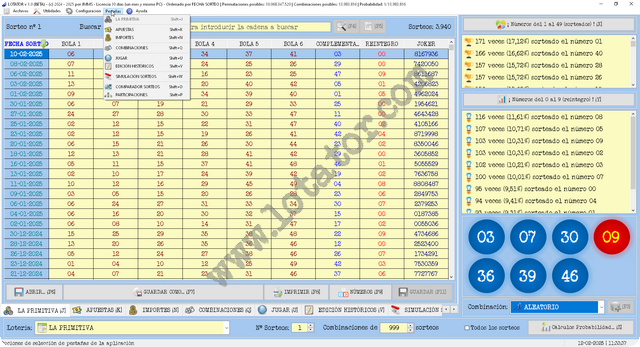Dispone de opción (botón) para cálculos complejos de combinaciones por probabilidad matemática y permite exportar a diferentes formatos los datos calculados en modo impresión (VISTA PREVIA), entre ellos, XLSX, CSV, TXT, HTML, PDF, etc...
